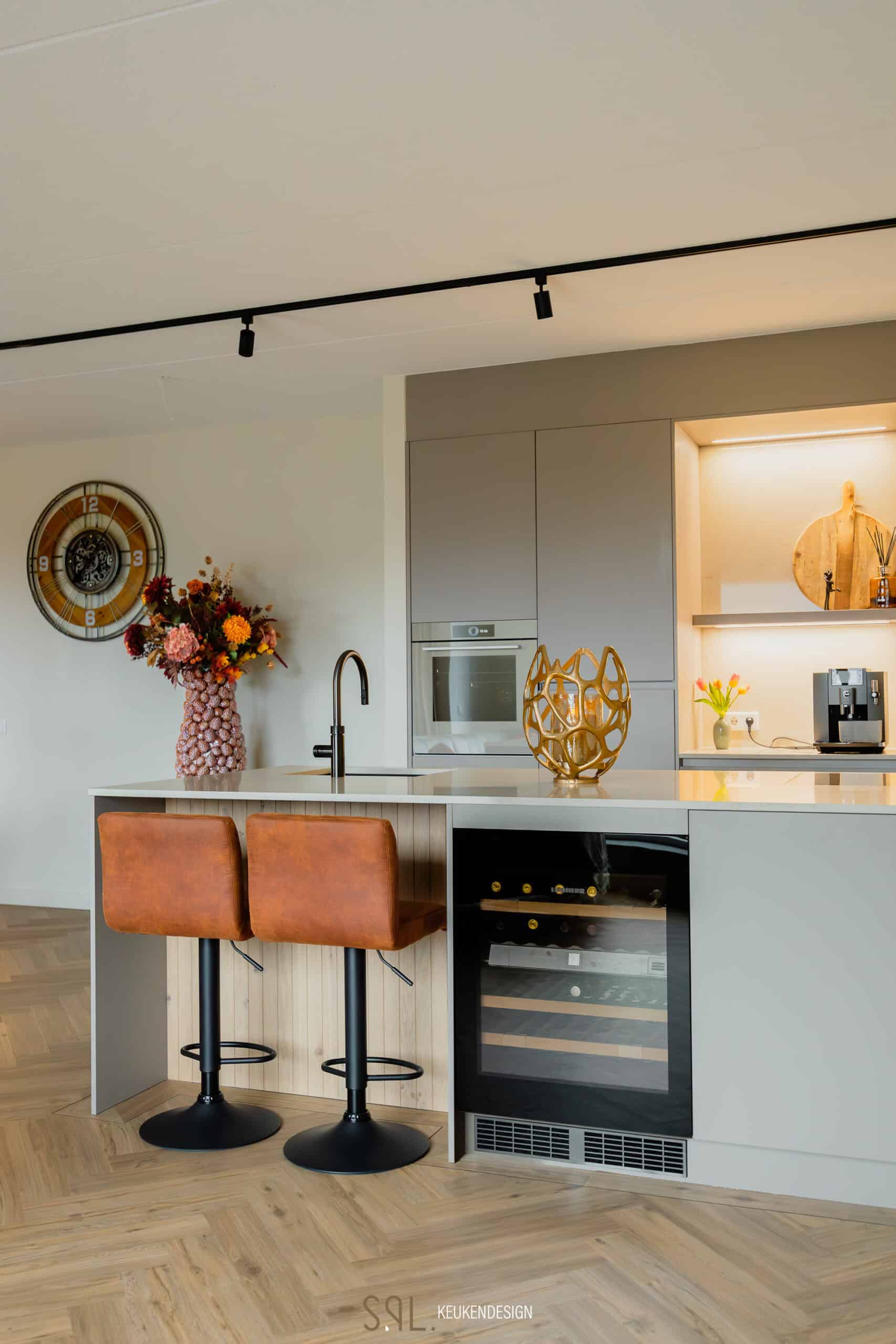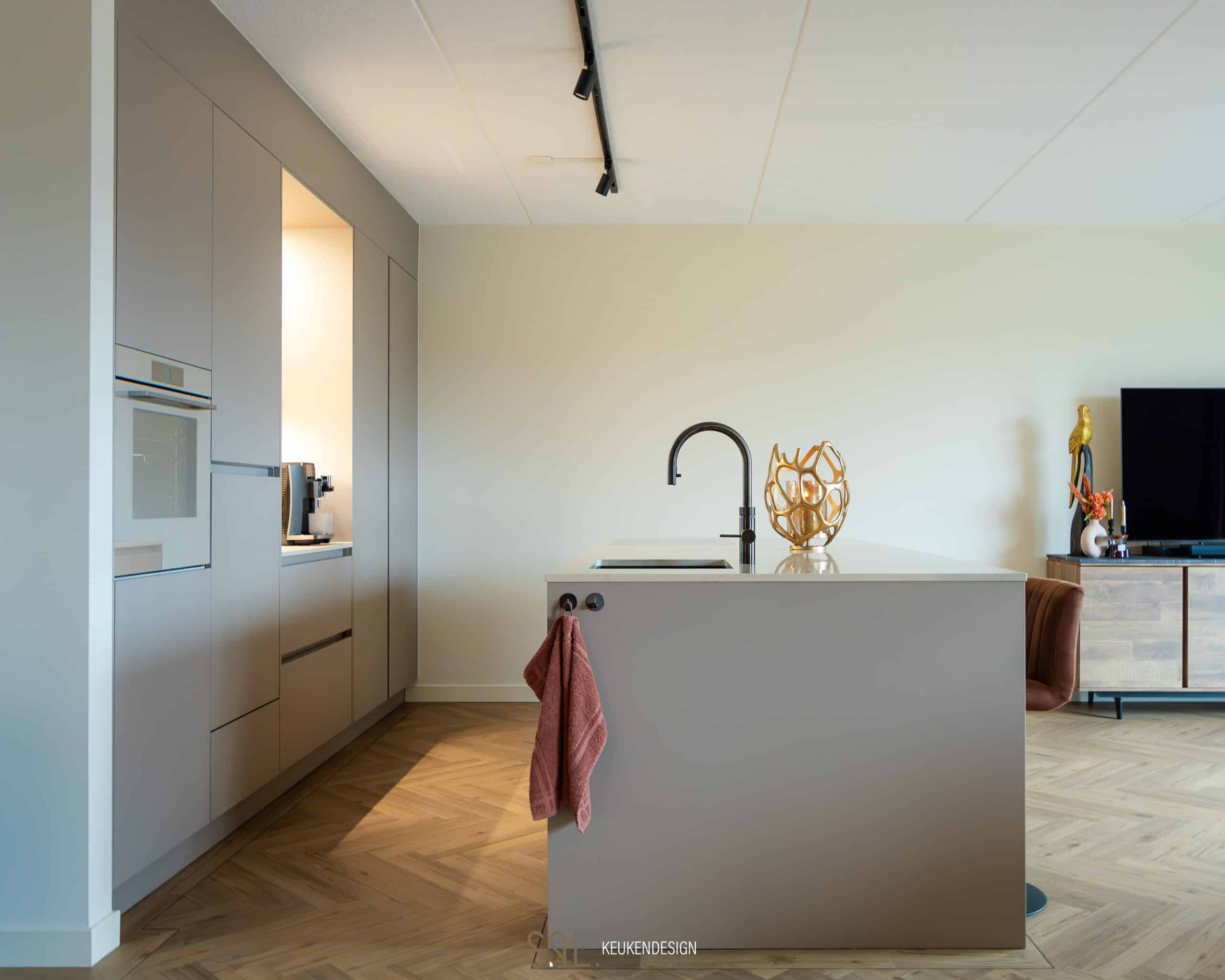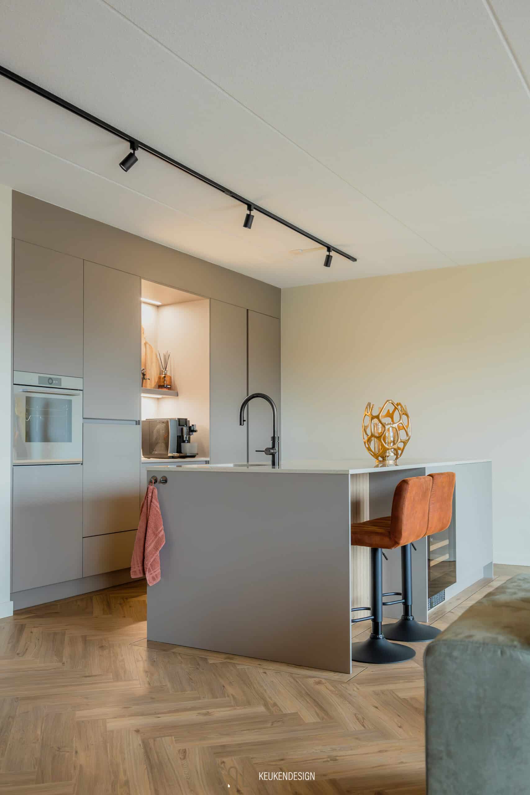 Rust & eenheid komen samen in deze prachtige ton-sur-ton keuken in de kleur Klei. De balans tussen design en functionaliteit wordt versterkt door het rustige Mayal Royal werkblad van @kemie.nl, welke een composiet is.