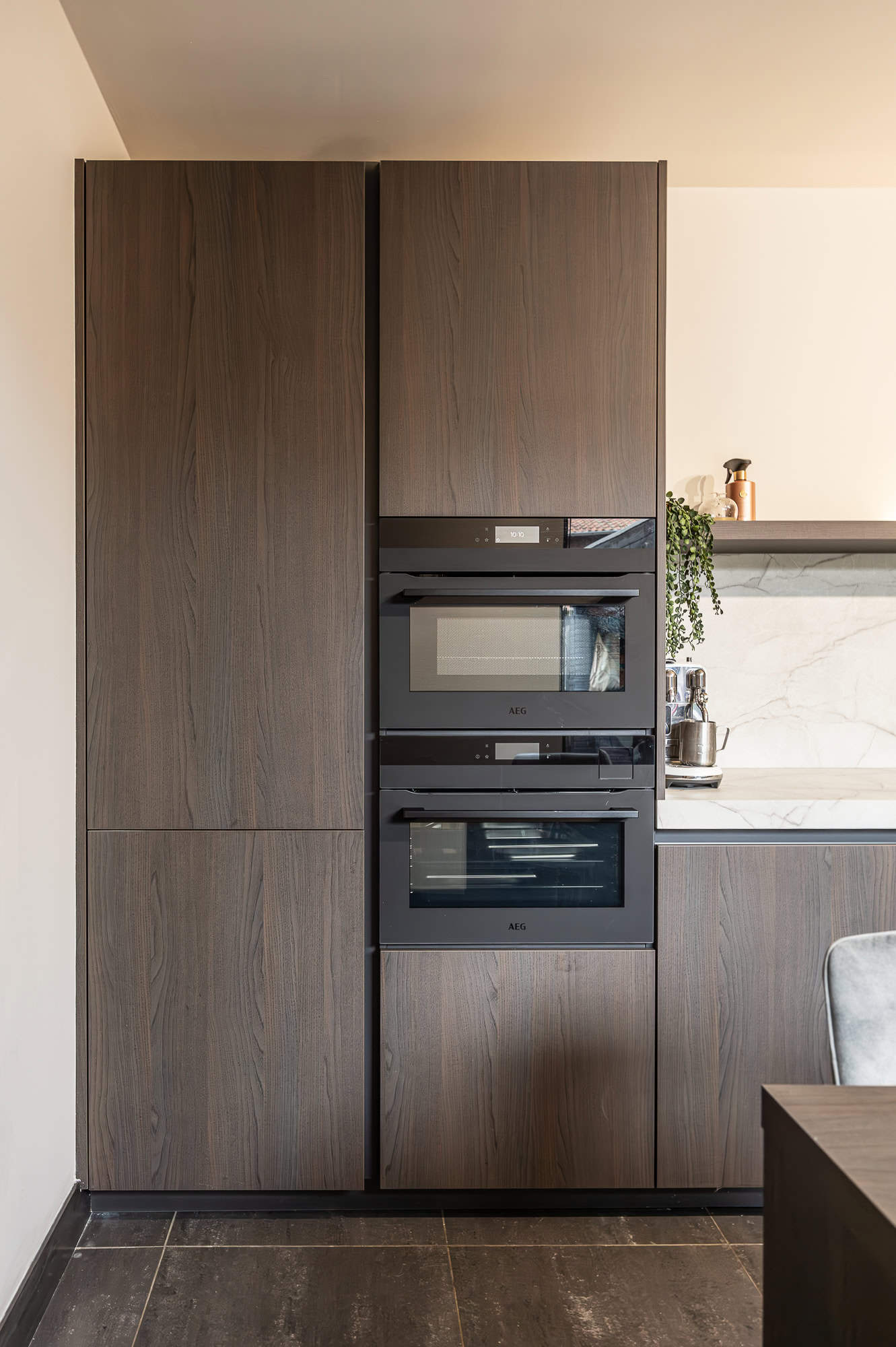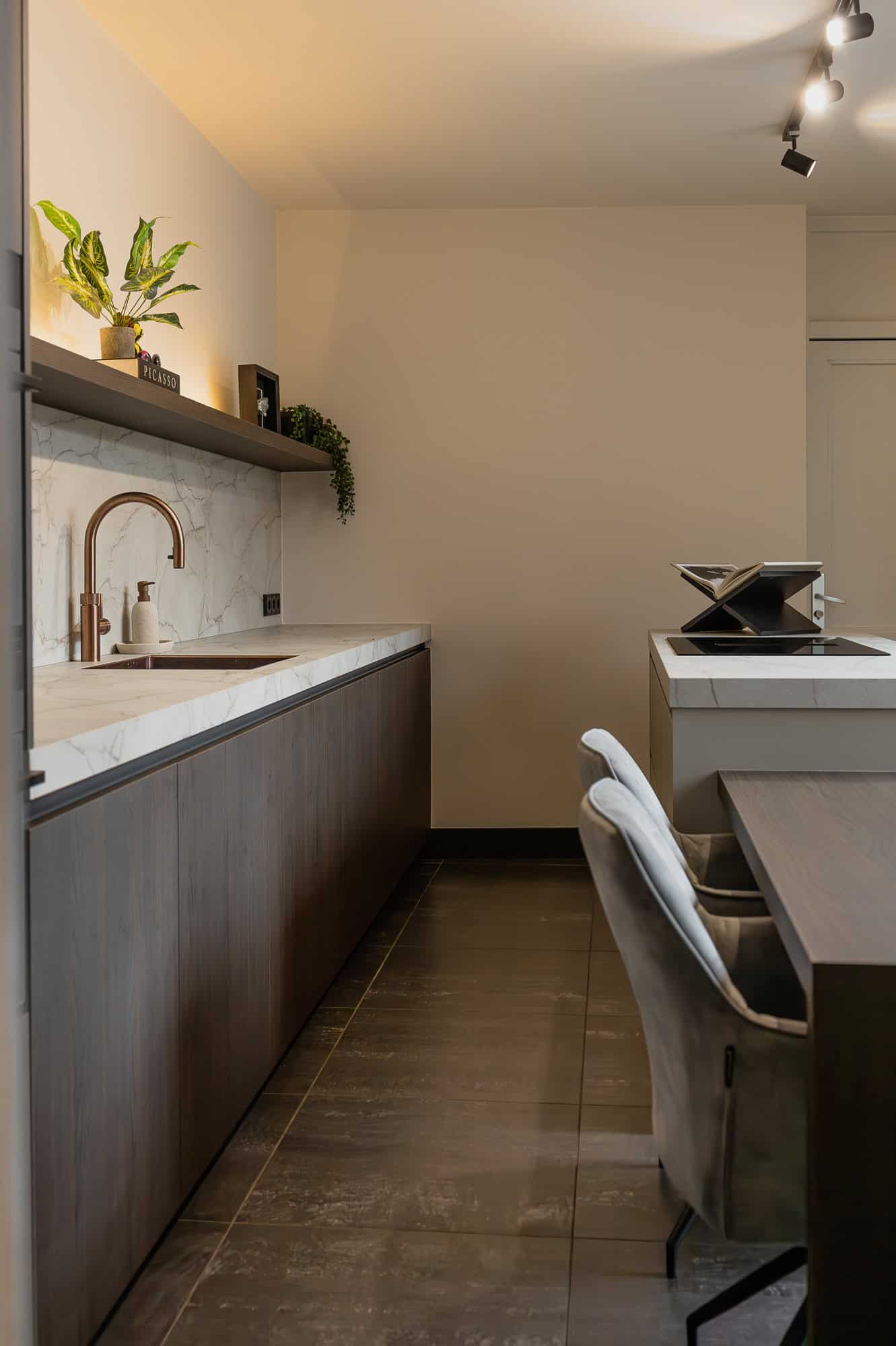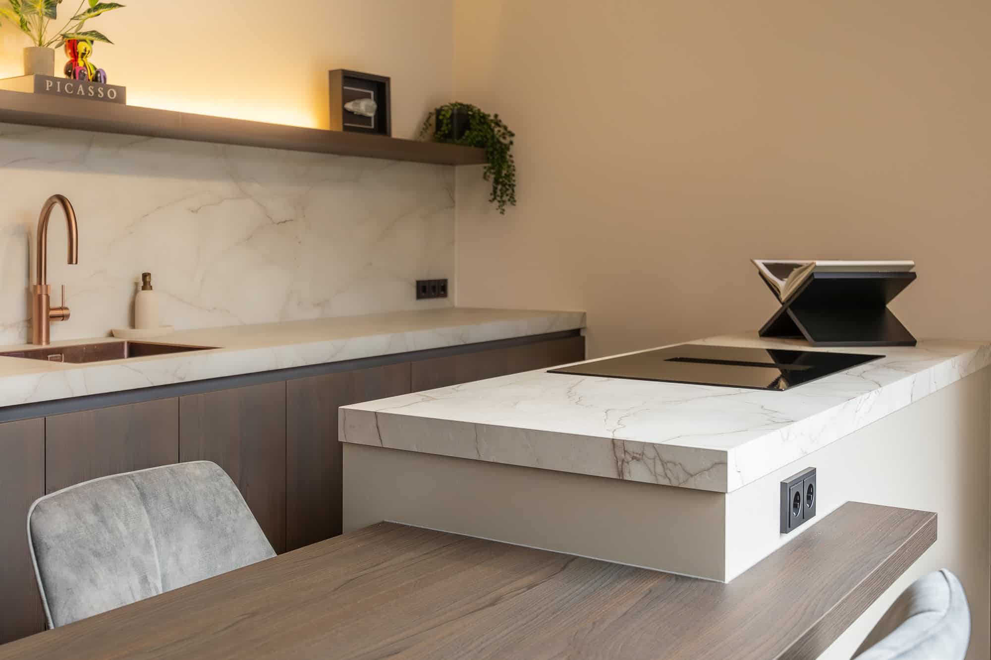 De keuken straalt warmte en klasse uit, vooral dankzij het prachtige ‘Cognac eiken’ front i.c.m. de ‘Sesam’. De chique details, zoals de koperkleurige semi-onderbouw spoelbak met bijpassende Quooker, geven de keuken een luxe touch. Daarnaast zijn de matzwarte ovens van AEG en de Novy easy werkbladafzuiging een perfecte aanvulling op het strakke design.