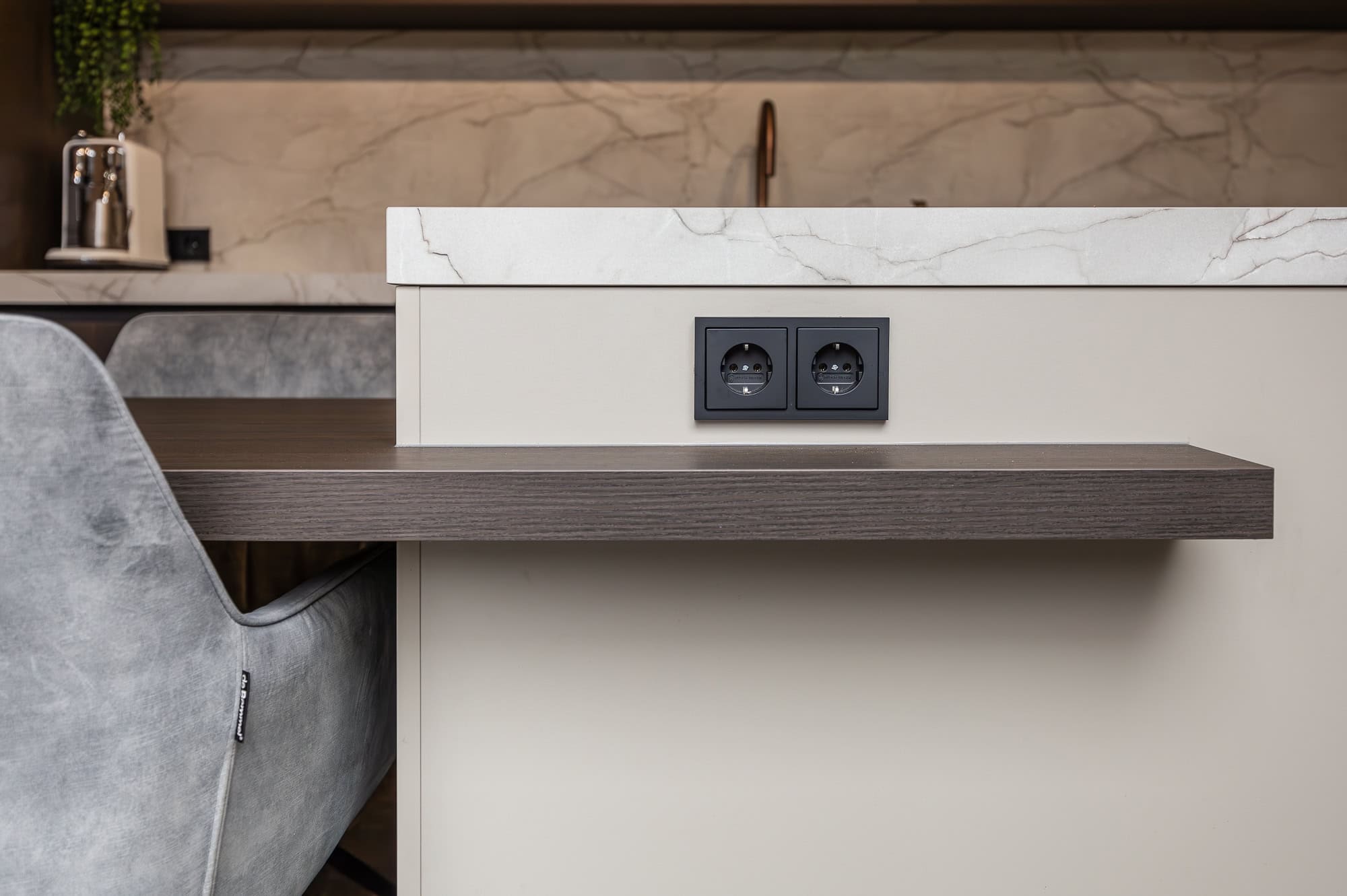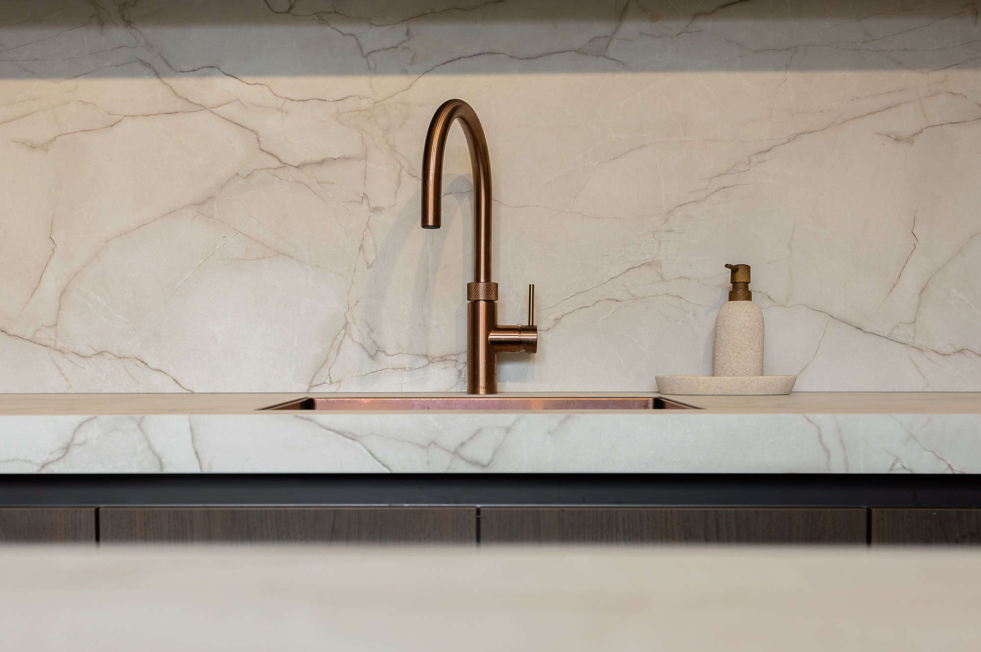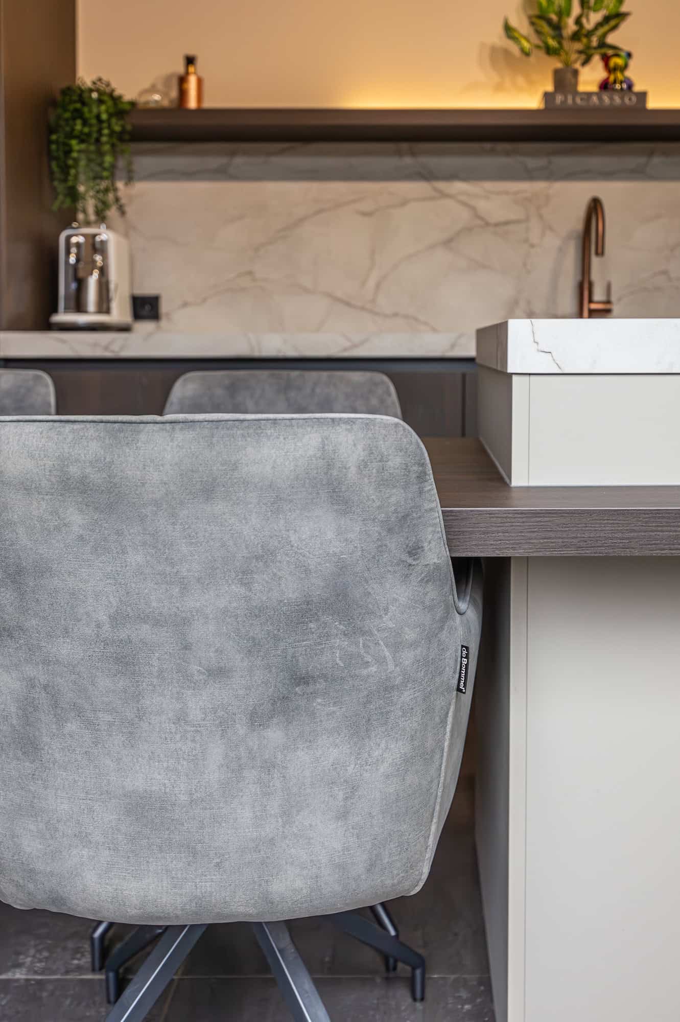 De keuken straalt warmte en klasse uit, vooral dankzij het prachtige ‘Cognac eiken’ front i.c.m. de ‘Sesam’. De chique details, zoals de koperkleurige semi-onderbouw spoelbak met bijpassende Quooker, geven de keuken een luxe touch. Daarnaast zijn de matzwarte ovens van AEG en de Novy easy werkbladafzuiging een perfecte aanvulling op het strakke design.