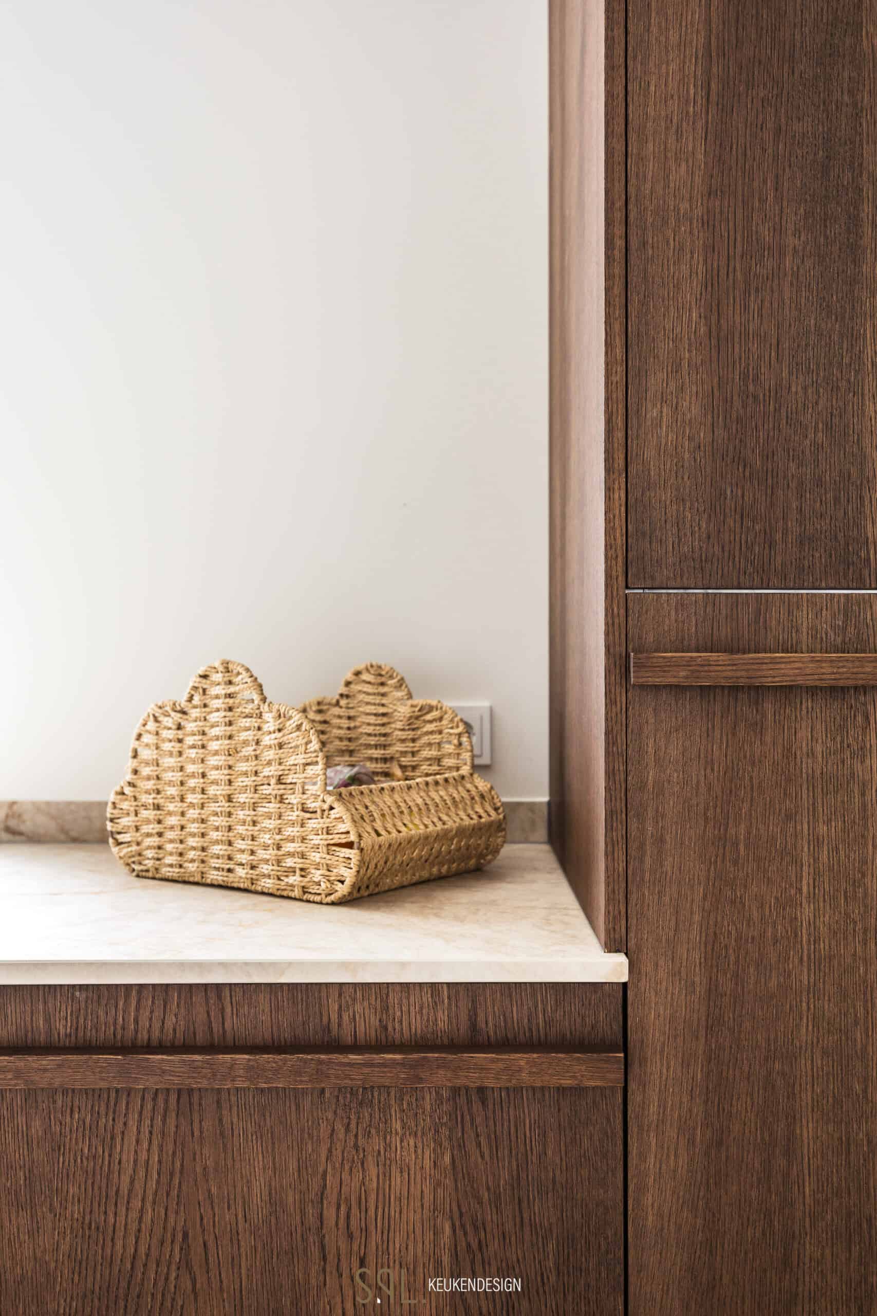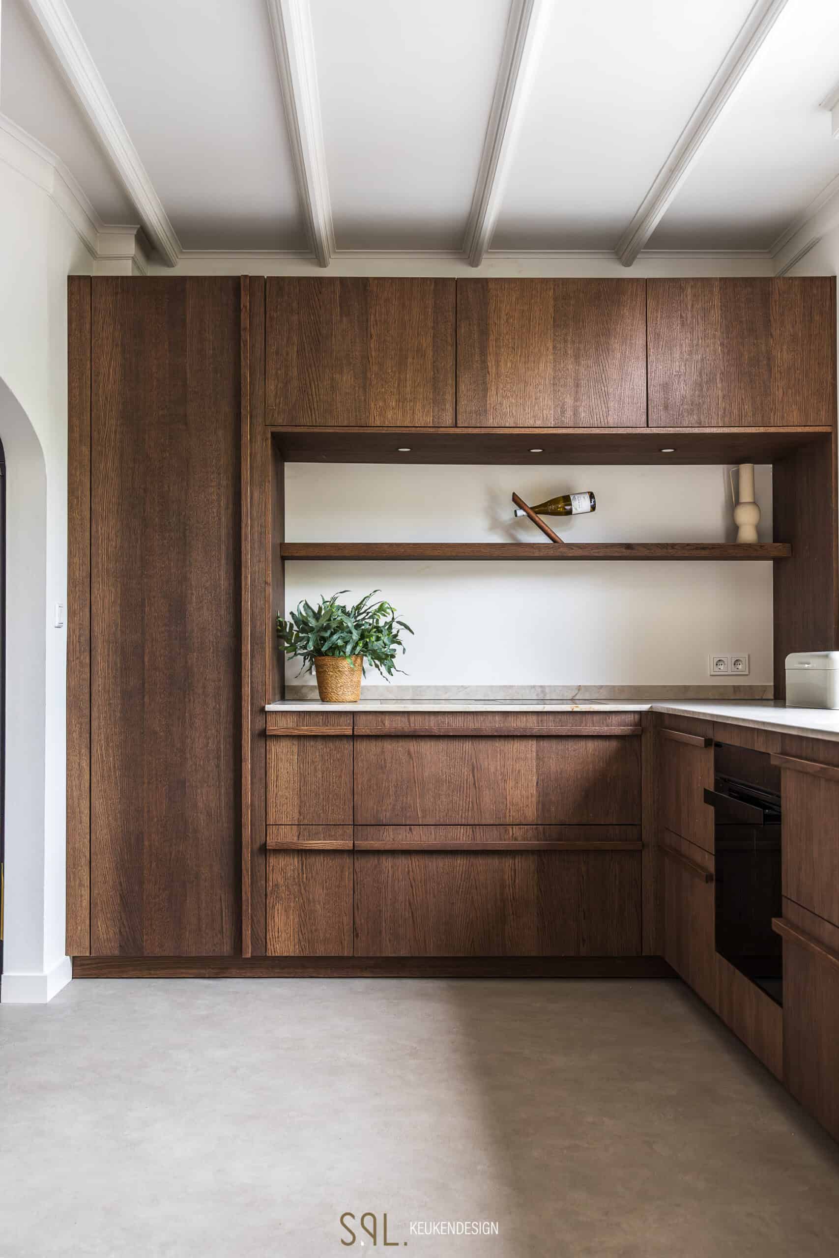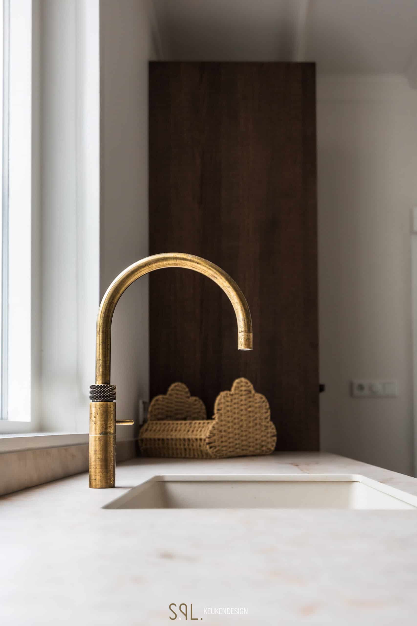 We werkten met fineer in de warme tint ‘Chocolate’ en keramiek werkblad ‘Crystal Gold’. De bijpassende composieten spoelbak en Quooker in messing patina maken het plaatje compleet. De kookplaat? Die blendt subtiel weg in het werkblad — een strakke oplossing van Wave Design. En ja, de meterkast? Die hebben we slim weggewerkt in het keukenontwerp. Spot jij ‘m?