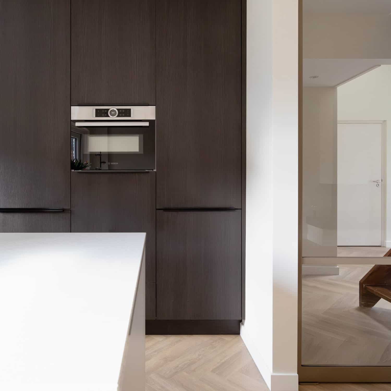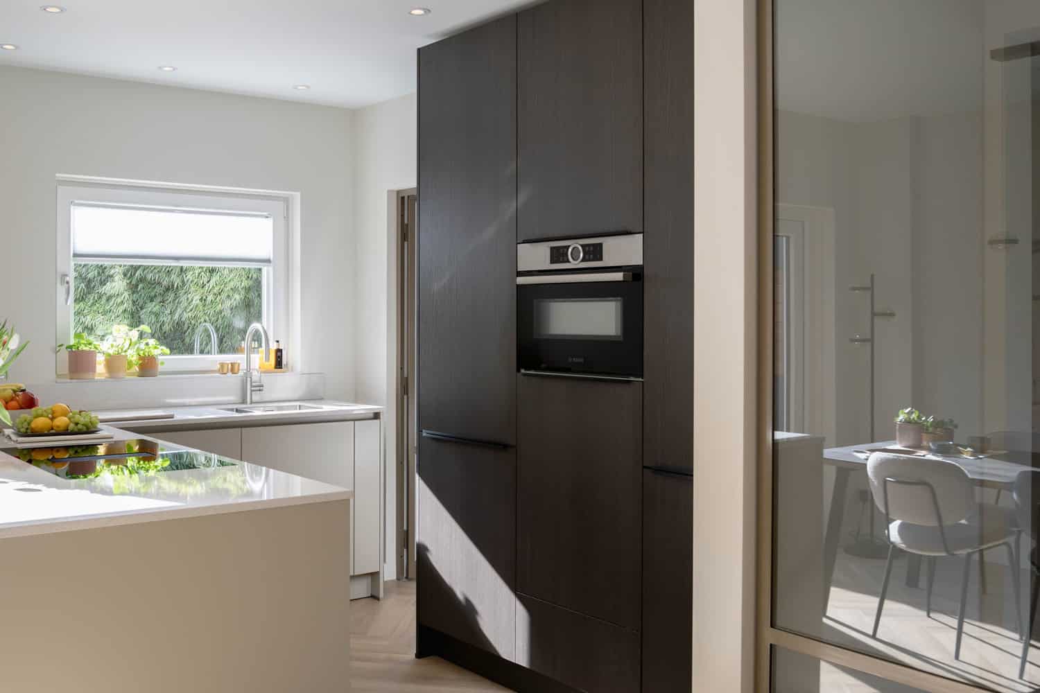 Als kers op een taart een prachtige OPEN keuken met bar. De poedercoat afwerking i.c.m. met de warme houtlook kastenwand, geeft een speels maar toch rustig effect. Wanneer u de keuken doorloopt, komen we uit in de bijkeuken, waar we ook nog eens de wasmachine en droger hebben weggewerkt!